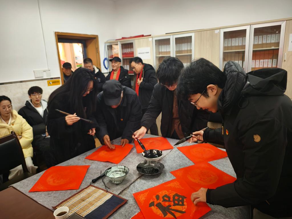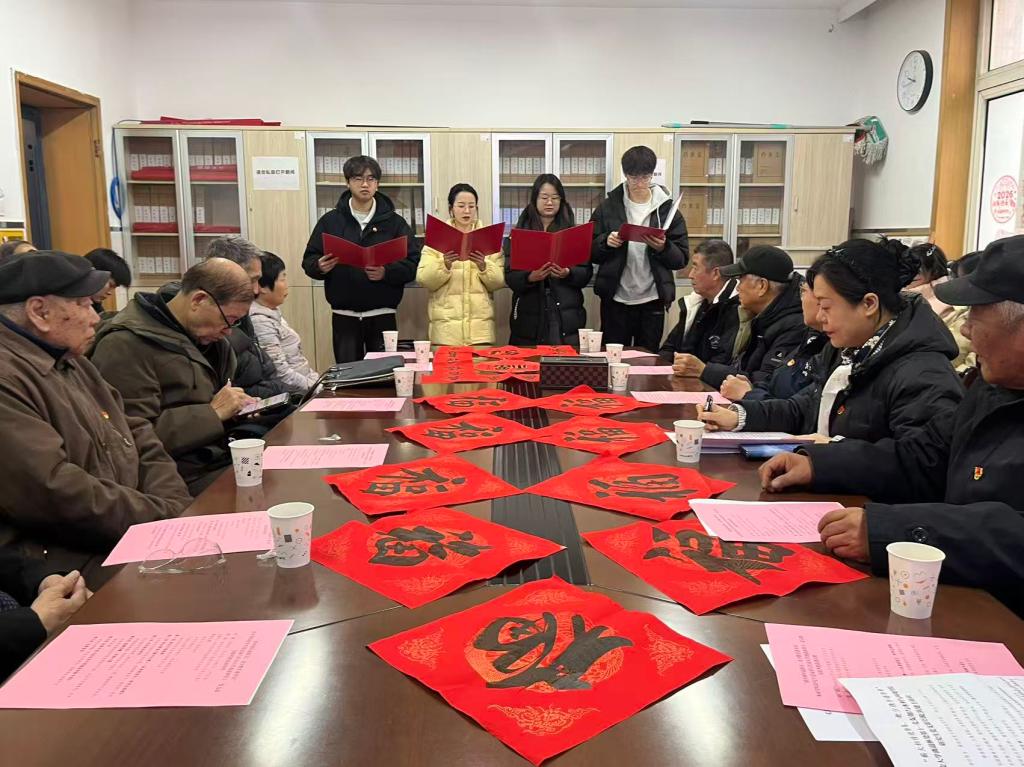 活动现场,学生党员朗诵《新年礼赞——沐党恩笃行,承师志深耕》他们围绕党的百年奋斗历程展开,在回顾光辉岁月中重温初心使命,既诚挚致敬了离退休老教师党员的坚守与奉献,也鲜明表达了青年一代赓续薪火、奋楫前行的信念与决心。朗诵结束后,青年学子与离退休党员共同书写新春的祝福。老党员的笔墨端庄沉稳、底蕴深厚,学生们的笔迹虽显稚嫩却灵动洋溢,两代人同台执笔、以墨会友,方寸红纸之上,不仅承载着新春的美好祝愿,更传递着中华优秀传统文化的薪火传承。